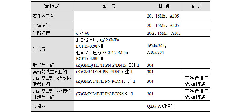 注入閥由注入閥本體、噴嘴組件、堵頭以及密封用O形圈組成,本體則與注醇霧化器的主管組焊在一起。 9.3注入閥的使用與更換 注入閥噴嘴為固定小孔,根據訂貨要求的注入量參數,在產品出廠時由我公司設計確定好噴嘴孔直徑,現場不需要對該閥進行調節。在該閥前端加裝了法蘭式高密封截止閥,注入閥前端壓力和流量可由該法蘭式高密封截止閥來調節,一般情況下壓差在1.0MPa左右即可。壓差越大,通過注入閥的流量越大。經測試壓差在0.6~2.0MPa范圍內均能達到滿意的霧化效果。在使用過程中可通過調節注入閥前端的壓差來滿足注入劑的流量要求。 經過一段時間的使用后,當壓差調低而流量顯著增大時,說明注入閥的噴嘴孔經沖刷磨損變大,需要更換噴嘴。更換時只需要更換噴嘴組件即可,注入閥本體和堵頭無需更換。 10.霧化器安裝與使用 10.1 產品出廠時,兩端配對法蘭拆下分別裝箱,到現場再安裝。(訂貨要求提供配套法蘭時) 10.2 安裝前,應清洗注醇管路,防止雜物進入注入閥,堵塞管路和噴嘴。 10.3正常使用時,注醇管路應水平安裝,可靠焊接。 11.訂貨須知 11.1注入管道(匯管)設計壓力、外徑×壁厚、材質; 11.2輸送管道(主管)壓力、外徑×壁厚、材質; 11.3進液接管外徑×壁厚、材質; 11.4輸送管道(主管)法蘭標準及密封面型式; 11.5注入量; 11.6工作溫度; 11.7輸送介質及注入介質。