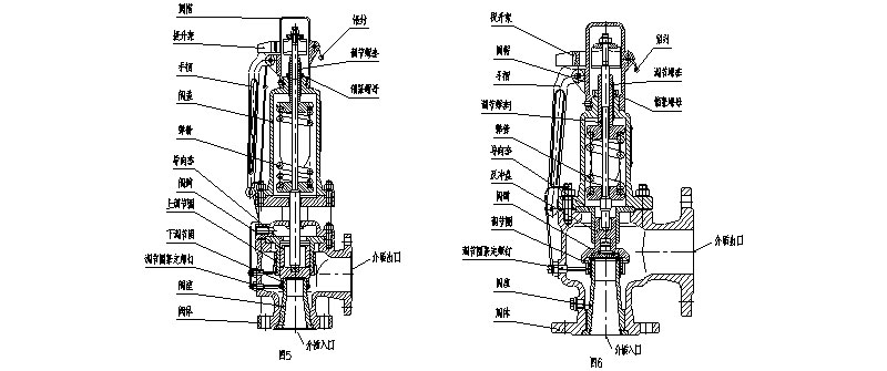 ⑶ 原則上一個(gè)安全閥單獨(dú)使用一根排放管較好,當(dāng)兩個(gè)以上安全閥共用一根集合管時(shí),集合管要有足夠的排放面積,在排放管導(dǎo)入集合管處,流向的轉(zhuǎn)折應(yīng)盡可能小。 ⑷ 排放管應(yīng)開設(shè)適當(dāng)?shù)呐判箍祝乐褂辍⒀├淠旱确e聚在排放管內(nèi)。 ⑸ 排放管的重量由安全閥出口支管來支承是不合理的,而應(yīng)當(dāng)由專門的支座來承受,支座應(yīng)能防止管道由于安全閥排放時(shí)反作用力的作用而移動(dòng)或振動(dòng)。 四、安全閥性能調(diào)整指導(dǎo) 本單位所提供安全閥,按標(biāo)準(zhǔn)規(guī)定在常溫下進(jìn)行出廠試驗(yàn),而安全閥實(shí)際工況和常溫整定調(diào)壓存在溫差,故而造成常溫定壓和實(shí)際工況兩者之間整定壓力(開啟壓力)的偏差。為此對(duì)具有較大溫差的安全閥必須進(jìn)行熱態(tài)調(diào)壓。其調(diào)整的內(nèi)容一般分整定壓力(開啟壓力)的調(diào)整和排放與回座壓力的調(diào)整。下面以我單位的兩種產(chǎn)品(見圖5,圖6)為例作詳細(xì)描述。