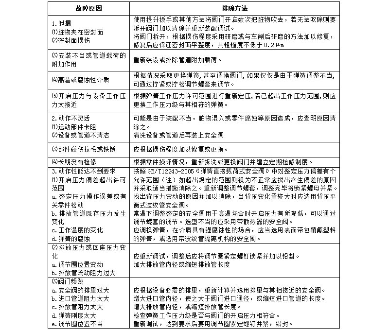 六、安全閥的維護(hù)與保養(yǎng) 為保證安全閥工作可靠及延長安全閥的使用壽命,在使用中應(yīng)做到: 1. 定期檢查運(yùn)行中的安全閥是否泄漏, 卡阻及彈簧銹蝕等不正常現(xiàn)象,并注意觀察調(diào)節(jié)螺套及調(diào)節(jié)圈緊定螺釘?shù)逆i緊螺母是否有松動(dòng), 若發(fā)現(xiàn)問題應(yīng)及時(shí)采取適當(dāng)措施。 2. 應(yīng)定期將安全閥拆下進(jìn)行全面清洗,檢查并重新研磨,定壓后方可重新使用。 3. 安裝在室外的安全閥要采取適當(dāng)?shù)姆雷o(hù)措施,以防止雨、霧、塵埃銹污等臟物侵入安全閥及排放管道,當(dāng)環(huán)境低于攝氏零度時(shí),還應(yīng)采取必要的防凍措施以保證安全閥動(dòng)作的可靠性。