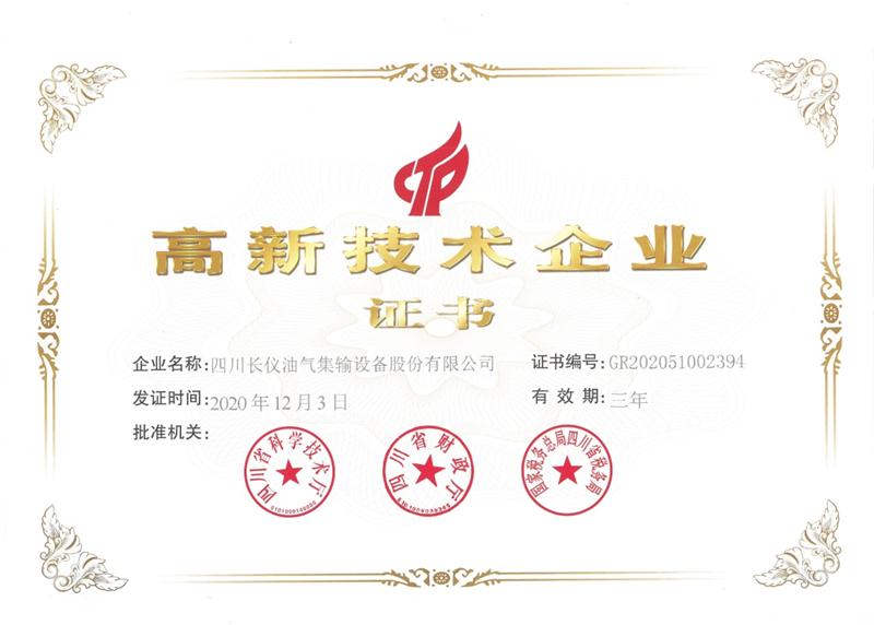 金鼠辭舊,金牛迎新之際,四川長儀油氣集輸設備股份有限公司再次通過國家高新技術企業認定。公司自2000年認定為高新技術企業以來,經過多次復審、申報認定均順利通過,一直保持高新技術企業資質。